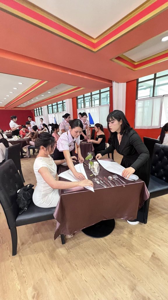 นอกจากนี้ นักศึกษายังได้เรียนรู้มารยาทและขั้นตอนการบริการเครื่องดื่ม โดยมีการสาธิตการเสิร์ฟ Red Wine และ White Wine ตลอดจนการจัดและตกแต่งห้องอาหารในรูปแบบ Fine Dining