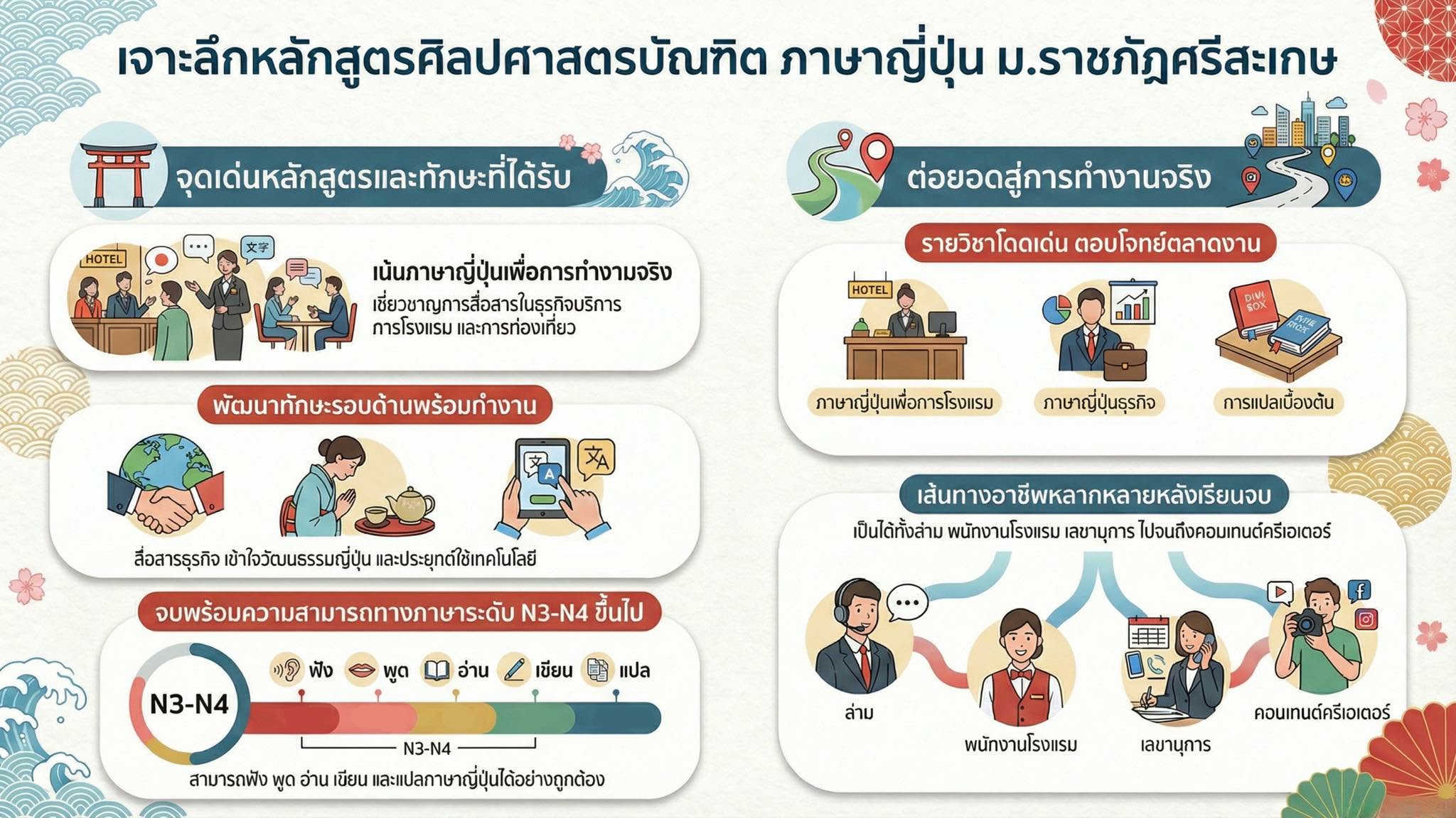 สาขาวิชาภาษาญี่ปุ่นมีศักยภาพในการพัฒนาทักษะผู้เรียน โดยอาจารย์ประจำหลักสูตรจำนวน 5 คน มีอาจารย์ที่จบการศึกษาในระดับมหาบัณฑิตในสาขาวิชาภาษาญี่ปุ่น จำนวน 5 คน ในจำนวนอาจารย์ประจำหลักสูตรนี้มีอาจารย์ที่มีตำแหน่งทางวิชาการเป็นผู้ช่วยศาสตราจารย์ จำนวน 1 คน  และอาจารย์ทั้ง 5 คนมีผลงานทางวิชาการคือการตีพิมพ์บทความวิชาการในวารสารวิชาการระดับชาติและมีประสบการณ์ในการสอนระดับอุดมศึกษามาไม่น้อยกว่า 8 ปี มีคุณวุฒิที่สอดคล้องกับสาขาวิชาภาษาญี่ปุ่น และมีประสบการณ์การสอนภาษาญี่ปุ่นให้แก่ผู้เรียนที่ใช้ภาษาญี่ปุ่นเป็นภาษาต่างชาติมาไม่น้อยกว่า 5 ปี นอกจากนี้สาขาวิชาภาษาญี่ปุ่นมีแหล่งเรียนรู้ ได้แก่ ห้องวัฒนธรรมญี่ปุ่น ห้องสมุดมหาวิทยาลัยราชภัฏศรีสะเกษ และสื่อการเรียนรู้ มีความร่วมมือทางวิชาการกับองค์กร NPO ประเทศญี่ปุ่น และมีเครือข่ายโรงเรียนต่าง ๆ เพื่อเป็นเวทีให้นักศึกษาได้พัฒนาตนเองในการทำกิจกรรมค่ายภาษาญี่ปุ่น และบริการวิชาการได้เป็นอย่างดี